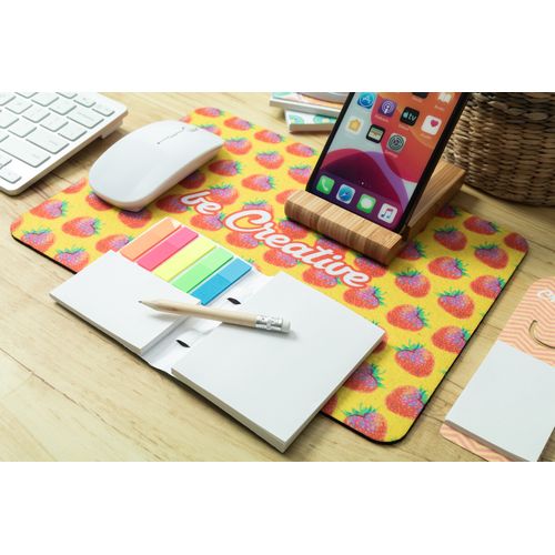 Custom made, seed paper covered sticky notepad with mini wooden pencil. Includes recycled paper sticky notes in 2 sizes (50 sheets of 100×75 mm, 25 sheets of 50×75 mm) and 100 plastic film page markers in 5 assorted colours (12×44 mm). Price includes full colour printed outside cover. MOQ: 100 pcs. With assorted wildflower seeds.