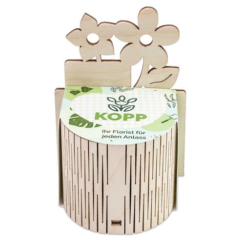 The lovingly designed Tiny Garden is a naturally beautiful highlight for every season . The small clay pot is surrounded by a filigree wooden fence and complemented by a rear back wall with a fine flower outline – ideal for a laser-engraved advertising message or logo. Filled with a compost pellet as soil and seeds of your choice, it creates a charming mini garden project. The individually printed paper band seals the set and harmoniously completes the product – a pleasant giveaway that perfectly combines naturalness and advertising impact.