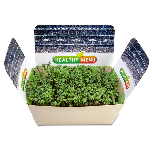 The Plantodrom offers event character in miniature format. The word fragment "drome" is associated with large stadiums, halls, buildings and events. And that's exactly what the miniature garden is made for: with attached, thematically matching side parts, for example, a football or sports stadium, a farm, an Easter nest, a colouring picture for children or many other buildings and containers are created that can be designed to match the brand, an event or a seasonal theme. In addition, another trend is focused on: Healthy food is in the customers' focus. Cress, basil, mixed herbs or spicy peppers can be grown in the bamboo paper bowl. The Plantodrom is supplied with a peat tab as soil and a bag of seeds. The individually designable plug-in parts are ready and waiting under the paper band, which is individually printed on all sides, and perfectly convey the advertising message.