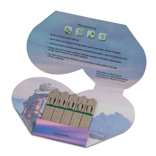 Spring and summer greetings or just say thank you from the heart! There are many occasions for a promotional greeting. With the seed sticks, you can have a surprise effect: Because in the flat little paper letters, there are no matches, but nice advertising greetings, which are perfect as mailing items thanks to their flat shape and low weight. The seeds are applied to five small paper sticks. When a stick is placed in soil and watered, a small plant will quickly sprout. The card itself can be customised on four sides. The paper is completely compostable and once again supports the green advertising idea. A planting guide completes this promotional item.