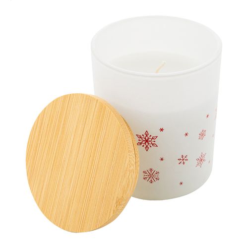 Scented plant-based wax candle in frosted glass holder with Christmas snowflake decoration and bamboo lid. With 120 grams of wax. In kraft paper box.