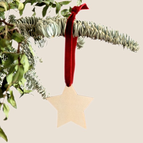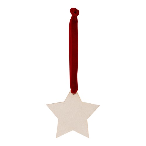 Hanging Christmas ornament, made of wood with decorative velvet ribbon.