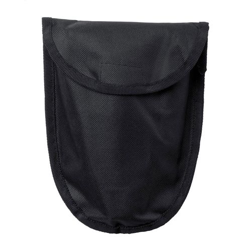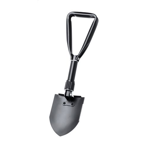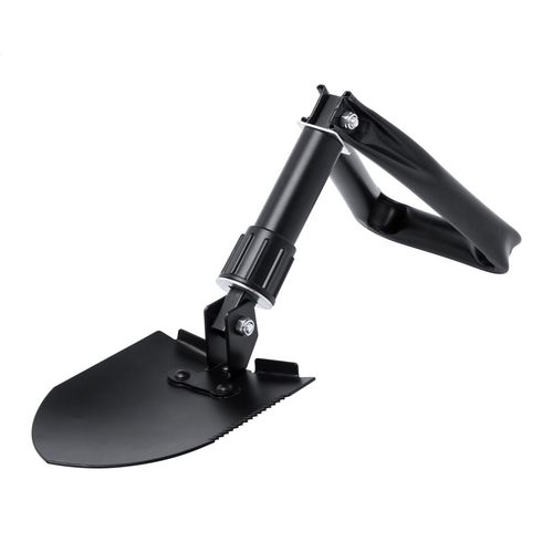 Foldable, carbon steel emergency shovel with carry pouch.