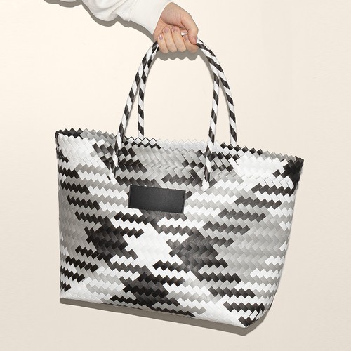 Beach bag with great capacity, made of braided plastic with long handles and smooth pvc patch in its front part to be printed.