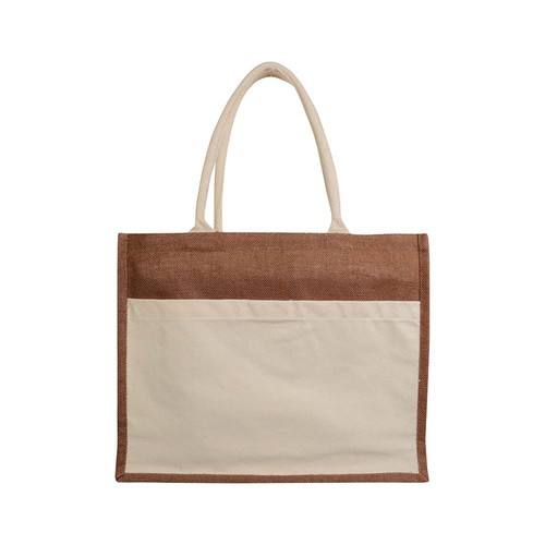Jute bag with PVC interior, gusset, long handles and outer pocket in natural cotton
