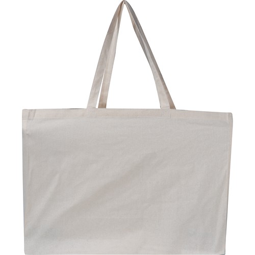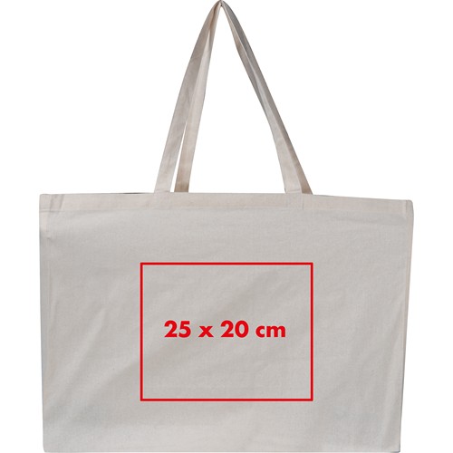 XXL shopping bag made of 140 gsm cotton, large bottom gusset and two long handles. It offers plenty of space for shopping, as a beach bag and much more. We print your logo on one side.