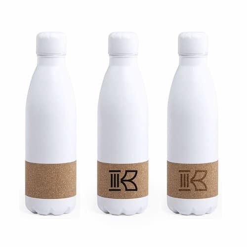 750 ml REVA bottle in matte whitestainless steel with Natural color cork band - 7.4x25.7cm. In individual box.