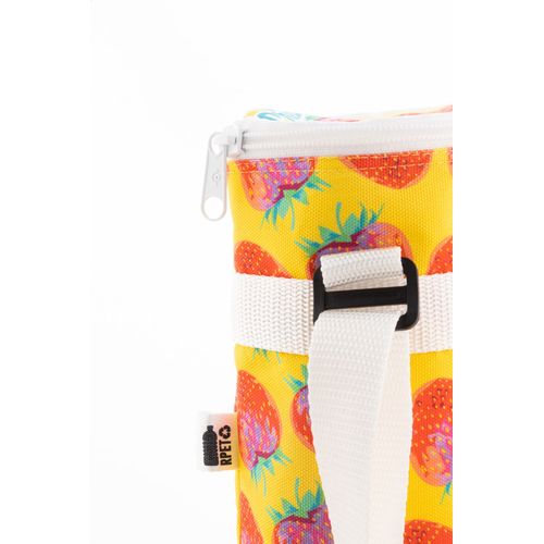 Custom made, zipped bottle cooler bag in 600D RPET polyester with aluminium padding and adjustable shoulder strap. Ideal for one 1,5 L bottle. With all over sublimation printed graphics and distinctive RPET label. MOQ: 25 pcs.