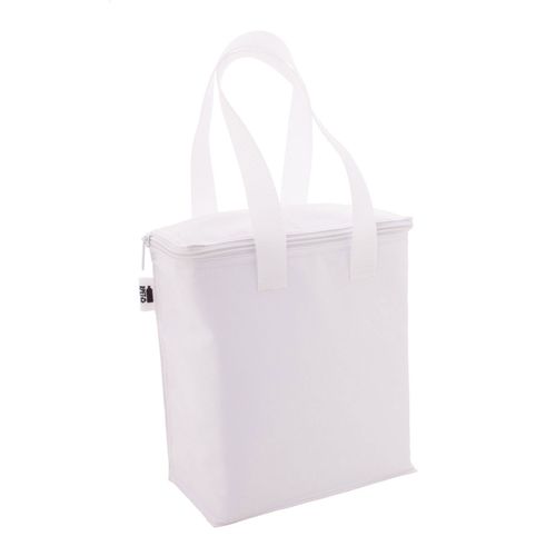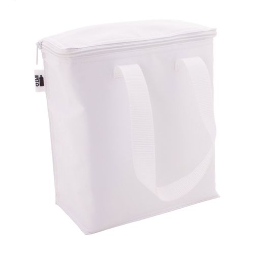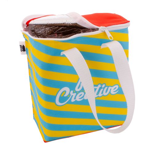 Custom made, zipped cooler bag in 600D RPET polyester with aluminium padding for 6 pcs 0,33 L cans. With all over sublimation printed graphics and distinctive RPET label. MOQ: 25 pcs.