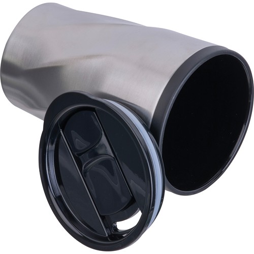 Double-walled thermal mug made of stainless steel with an inner plastic part (PP), a lid with a sliding drinking opening, and a capacity of 350 ml. Your logo is laser engraved on the upper third of the mug.