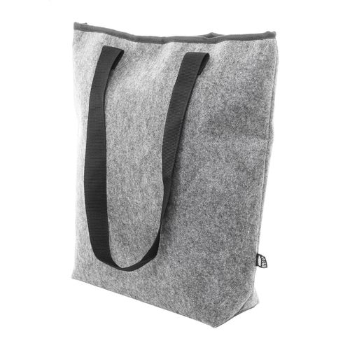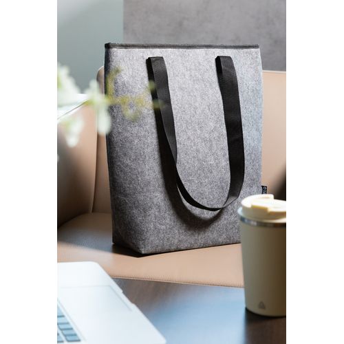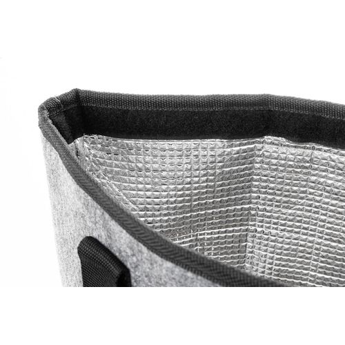 Cooler shopping bag in RPET felt with aluminium padding. With velcro closure, zipped front pocket and long handles. With distinctive RPET label.