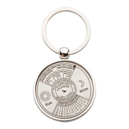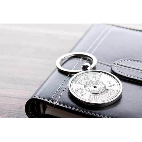 Metal keyring with rotating perpetual calendar until 2060. In black gift box.