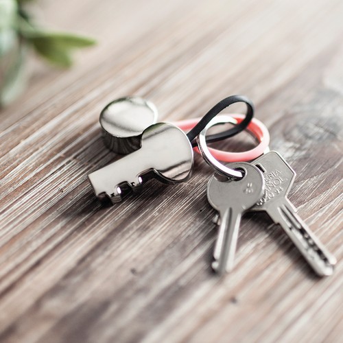 Round metallic keychain with rubber towrope in different colours. Presented within a black cardboard box.