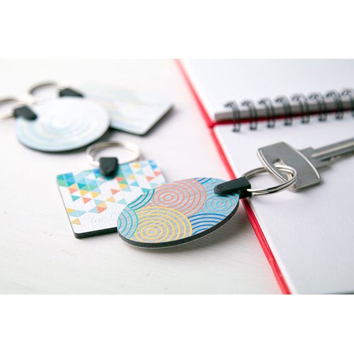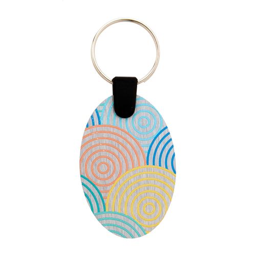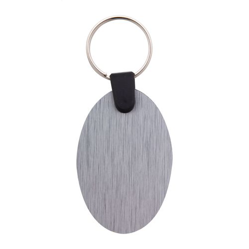 Oval shaped, brushed aluminium composite keyring with full colour printing. Price includes UV LED printing on one side. MOQ: 100 pcs.