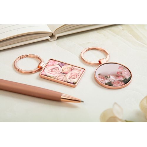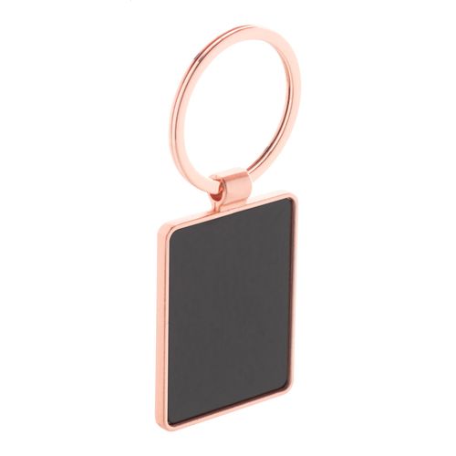 Rectangular shaped metal keyring in golden finish with gunmetal plate. In kraft paper box.