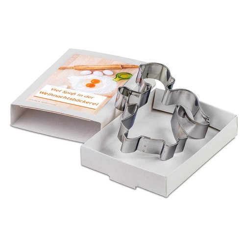 A small cardboard-box with great impact. The individual promotional message is located on the advertising card, which is slid into the lid. The slide box includes one baking shape made of stainless steel, made in Europe.