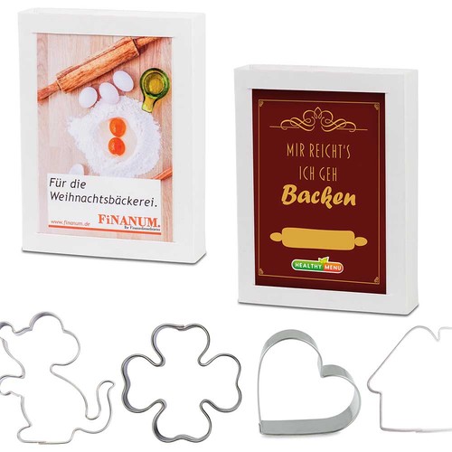 A small cardboard-box with great impact. The individual promotional message is located on the advertising card, which is slid into the lid. The slide box includes one baking shape made of stainless steel, made in Europe.