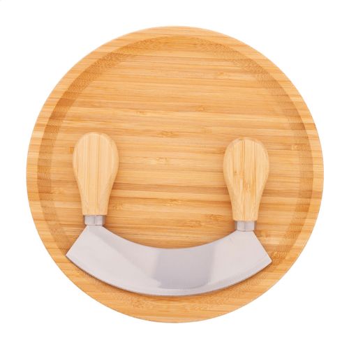 Bamboo herb cutting set, including a round bamboo cutting board and stainless steel herb cutter with bamboo handles.