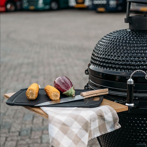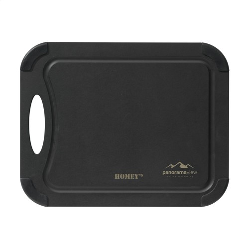 Handy cutting board from the Homey's brand. Made of sturdy wood fiber, with a circular groove to collect meat or fruit juices. The anti-slip corners provide extra stability while cutting and are removable for optimal hygiene. The cutting board does not absorb moisture, odors or bacteria. This keeps the board hygienic and easy to clean. The board is stain-resistant, heat-resistant up to 180°C and dishwasher-safe.