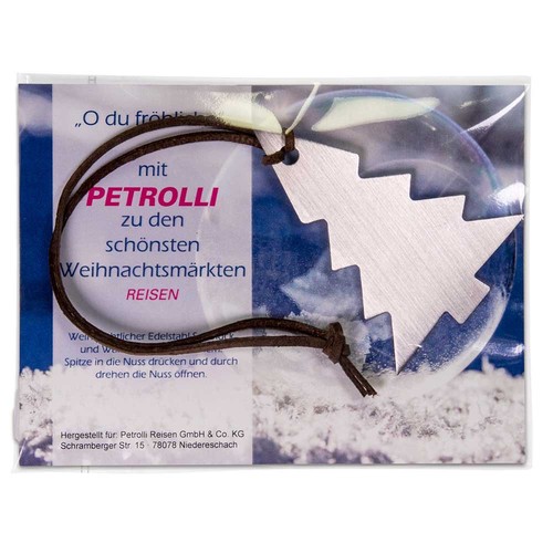 The original nutcrackers made of stainless steel, in the shapes comet, ice crystal or fir tree, impress with their functionality and a noble design. The nutcracker with leather strap is in a walnut and is packed in a transparent bag with an indivi-dually designed inlay. Just turn it and the hardest nut is cracked! The beautifully shaped nutcracker is also a Christmassy stainless steel decoration. Alternatively packed without nut in an elegant cello bag with advertising insert printed on both
