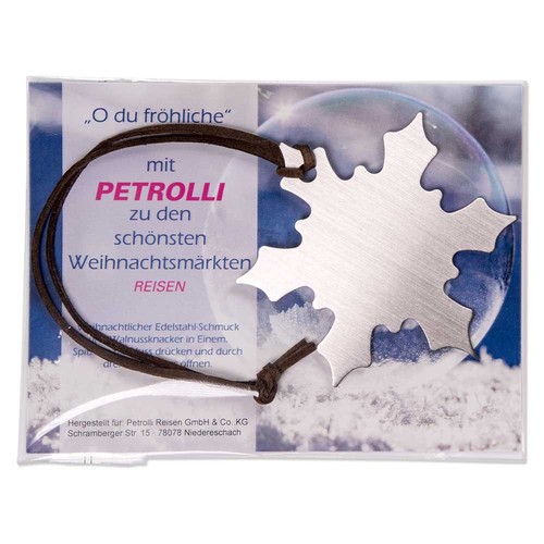 The original nutcrackers made of stainless steel, in the shapes comet, ice crystal or fir tree, impress with their functionality and a noble design. The nutcracker with leather strap is in a walnut and is packed in a transparent bag with an indivi-dually designed inlay. Just turn it and the hardest nut is cracked! The beautifully shaped nutcracker is also a Christmassy stainless steel decoration. Alternatively packed without nut in an elegant cello bag with advertising insert printed on both