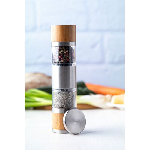 Double sided manual salt and pepper mill in stainless steel and bamboo housing, with ceramic grinder core.