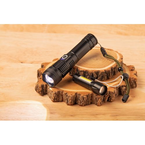 Aluminium flashlight with built-in USB rechargeable battery (400 mAh) and carry strap. With zoomable high power COB light at the font and COB floodlight on the side. With fixed and flashing light modes. Including USB charger cable.