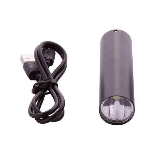 Aluminium flashlight with built-in USB rechargeable battery (400 mAh), high power COB light and carry strap. With fixed and flashing light modes. Including USB charger cable.
