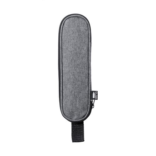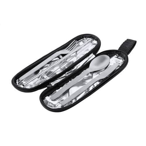 5 pc stainless steel cutlery set in RPET polyester pouch. Including fork, knife, spoon, drinking straw and cleaning brush.