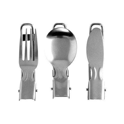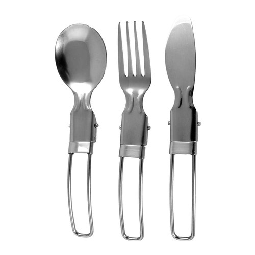 Stainless steel cutlery set of folding spoon, fork and knife. Presented in a black 600D RPET bag.