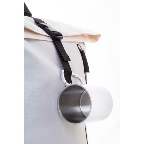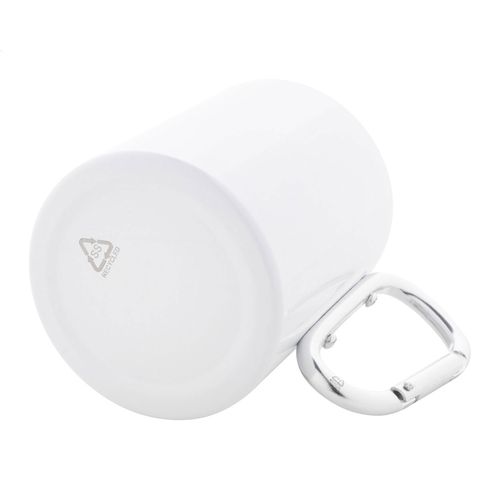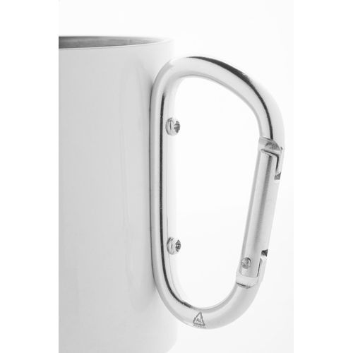 Double-wall, recycled stainless steel sublimation thermo mug with recycled aluminium carabiner handle. 300 ml. In kraft paper box.