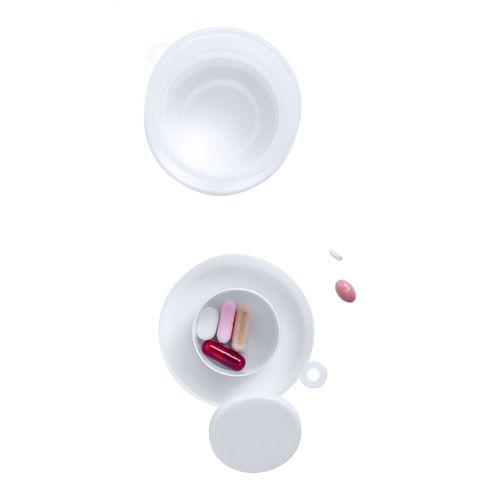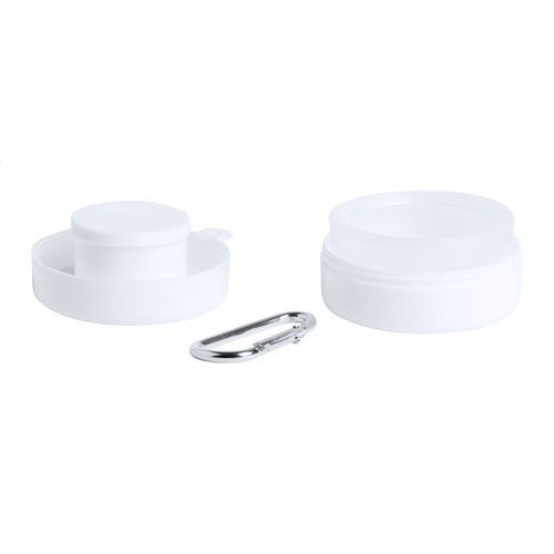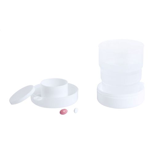 Plastic foldable cup with pillbox compartment and metal carabiner, 220 ml.