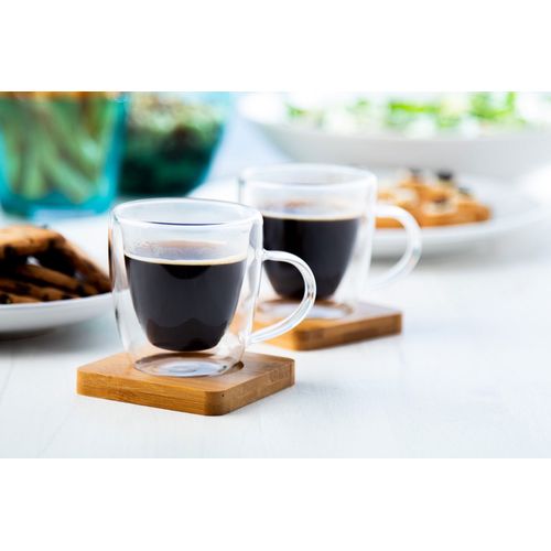 Double-wall borosilicate glass espresso cup set with 2 pcs of cups and bamboo saucers, 90 ml. In kraft paper display box.