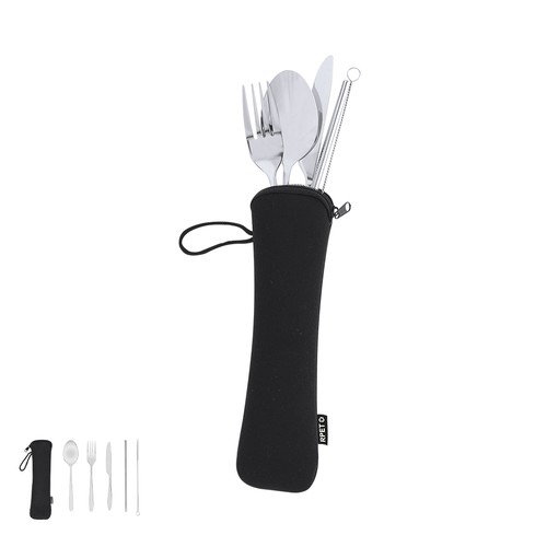 Set of 5-piece cutlery made of stainless steel. Includes spoon, fork, knife, reusable straw, and cleaning brush for the straw. Presented in a Soft Shell case made of RPET with zipper closure and transport cord. With RPET label on the tag.The RPET material is made from recycled plastic, promoting the reuse of plastic waste and helping the planet's sustainability.