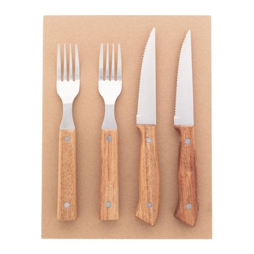 4 pc stainless steel steak cutlery set with acacia wood handles (2 steak knives, 2 forks). In kraft paper book shape box.