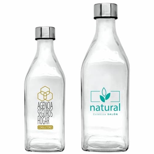 Delta square adCouleur vertising bottle, available in 500 ml and 1 l, with silver screw cap. They can be personalized in one or two colors, permanent glass printing, laser or without personalization. The models in our range of adCouleur vertising, reusable and ecological glass water bottles can be with a swing top or gaseous cap, cork cap, screw cap and different customizations such as laser, direct printing of permanent vitrified decal, depending on the model. Contact us if you can't find what you need or if you need an urgent delivery.