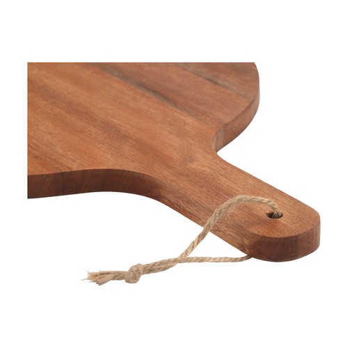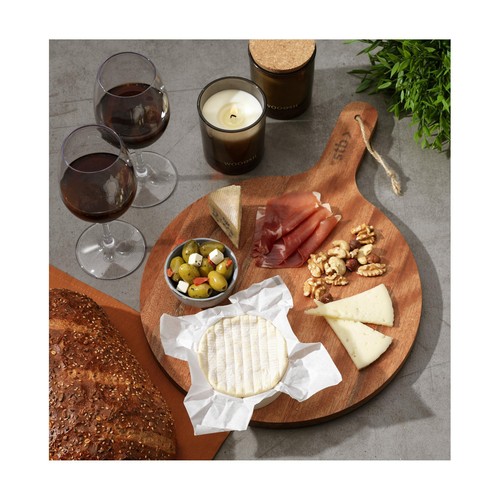 Beautiful, spacious Wooosh serving board made from FSC 100% certified acacia wood, a robust type of wood with a warm appearance. The natural markings, fine grain and varying colour shades make each board unique. The board has been carefully treated with a vegetarian soybean oil and is naturally hygienic thanks to the bactericidal properties of acacia wood. The round shape and the handle give the board a traditional look, while the string adds a practical and decorative detail. Ideal for stylishly presenting snacks, cheeses, pizza or for a cosy shared dining experience. Each item is supplied in a luxurious Wooosh gift box.