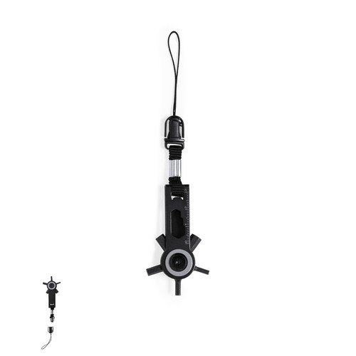 Efficient multi-tool with swivel head made of stainless steel with black finish. With 10 functions: allen spanners, hexagon spanner in various sizes, ruler and a practical carrying accessory with buckle fastener. Presented in a recycled kraft paper bag.