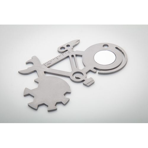 Stainless steel, bicycle shaped multi tool with 11 functions.