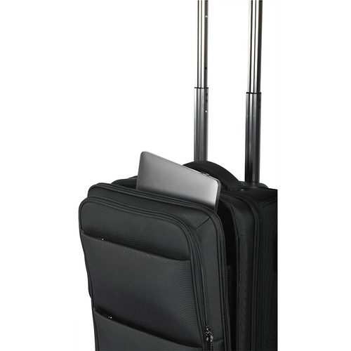 One of this year's new items, the cabin trolley in 1680D polyester (Q24766), is the perfect accessory for frequent travelers who desire practical and functional luggage.Ideal for business trips or short vacations, this trolley offers a versatile and organized solution for carrying clothes, electronic devices, and documents safely and neatly.Equipped with three separate compartments, two front pockets with zip closures, a back pocket with a zip closure, two padded handles, and a telescopic handle, it ensures practicality and comfort during transport.The trolley can be customized with single-color screen printing, ideal for flat color logos.