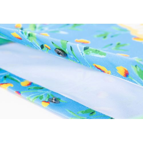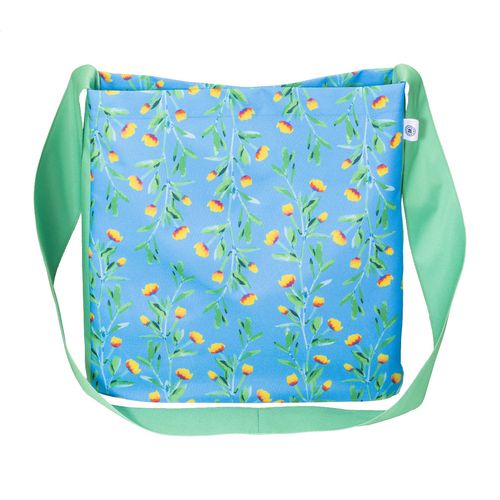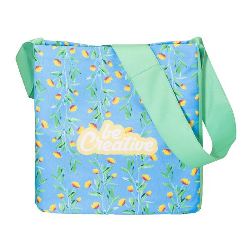 Custom made, shoulder bag in 600D RPET polyester with long shoulder strap and button closure. With all over sublimation printed graphics and distinctive RPET label. MOQ: 25 pcs.
