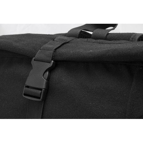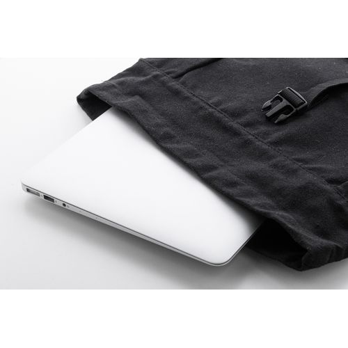 Recycled canvas rolltop backpack with buckle closure and zipped front pocket in soft recycled PU leather. With padded laptop (15") compartment, side pockets, padded back and shoulder straps. 70% recycled cotton and 30% RPET polyester. With distinctive recycled cotton label.