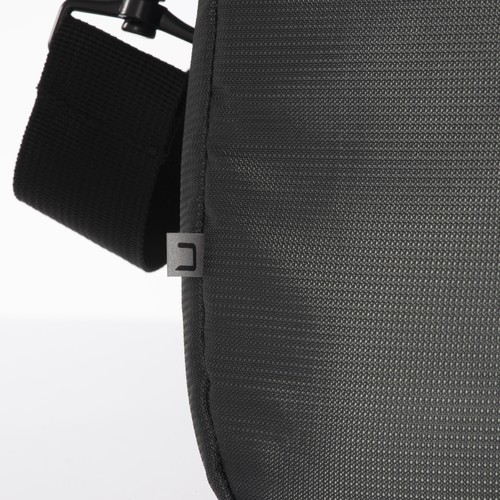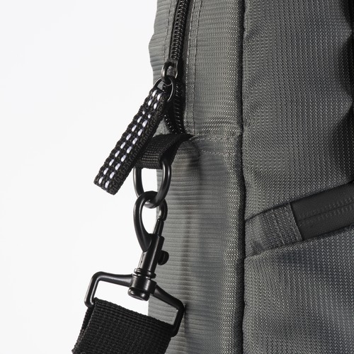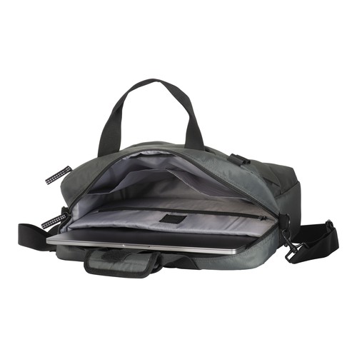Laptop bag in recycled PET. Paddednotebook compartment. Adjustable andremovable shoulder strap with metal buckle. Trolley attachment system
