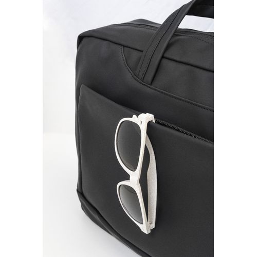 Waterproof, soft recycled PU leather document and laptop bag with zipped compartment, zipped front pocket, adjustable shoulder strap and padded laptop compartment (15"). With distinctive recycled PU label.