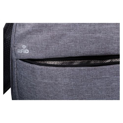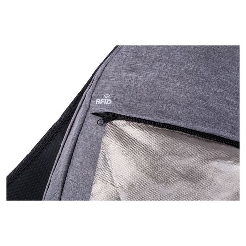 RFID protected backpack with multiple zipped compartments, padded laptop compartment (15"), padded back and shoulder strap. With built-in USB connection for power banks. 300D polyester.