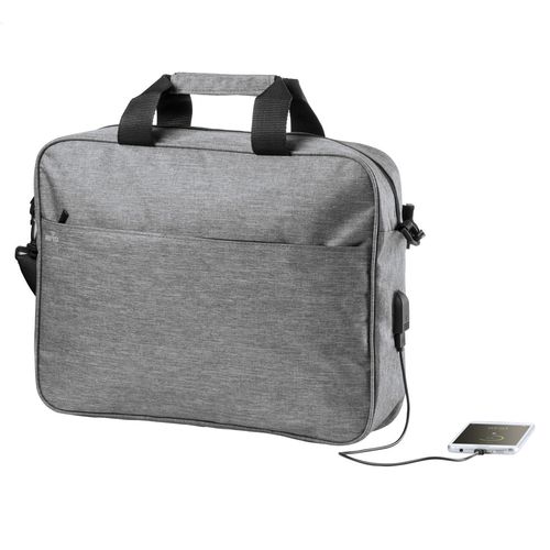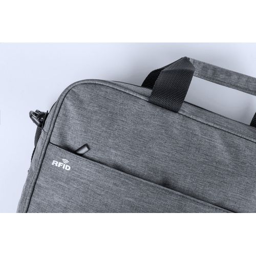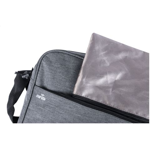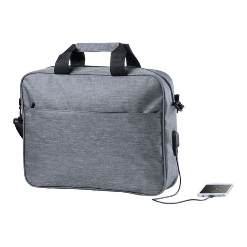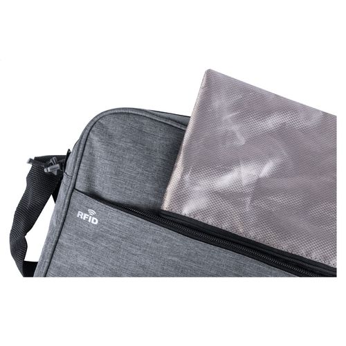 RFID protected document bag with padded laptop and tablet compartment (15" & 10"), padded back and shoulder strap. With built-in USB connection for power banks. 300D polyester.