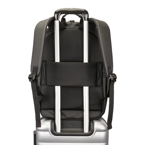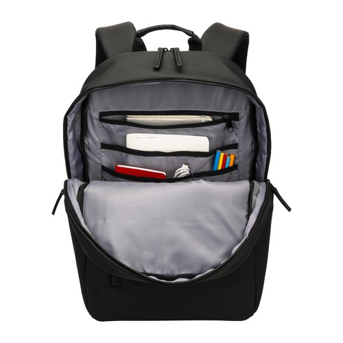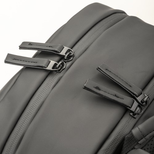 Water-resistant Soft PU (15") backpack. Padded inner pocket for notebook. Large main compartment, zipped front pocket and external bottle pockets. Padded back and shoulder straps with breathable material