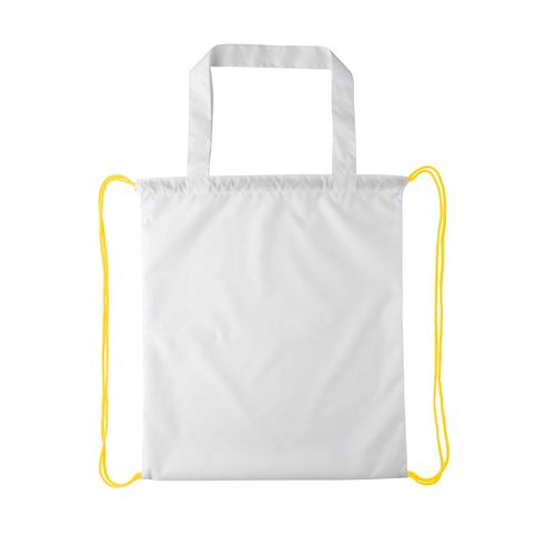 Custom made drawstring bag with coloured strings and long handles, 190T polyester. It can be also used as a shopping bag. With all over sublimation printed graphics. MOQ: 25 pcs.