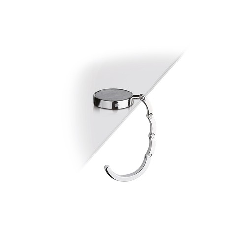 The metal table handbag hook (E14129) is the ideal accessory to keep bags always within reach and organized, avoiding placing them on the ground.Perfect for offices, restaurants, or conferences, this handbag hook offers a practical and hygienic solution for hanging bags securely and conveniently.Made of metal, the hook is foldable with a magnet and equipped with a metal tag, ensuring sturdiness and an elegant design.The hook can be customized with digital printing for vivid colors, laser engraving for precise details, or pad printing for flat color logos.