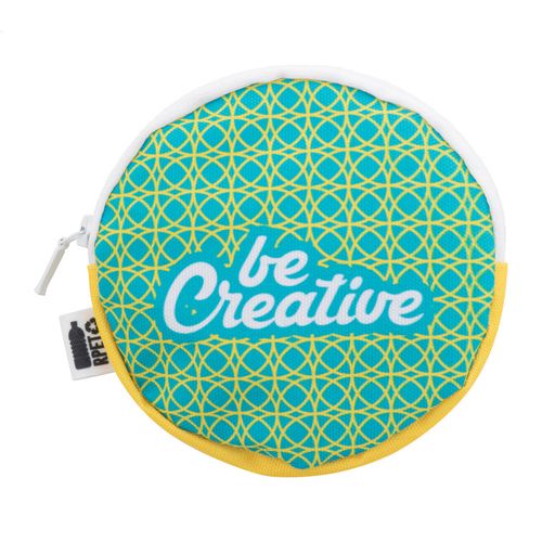 Custom made, round zipped purse in 600D RPET polyester. With distinctive RPET label and all over sublimation printed graphics. MOQ: 50 pcs.